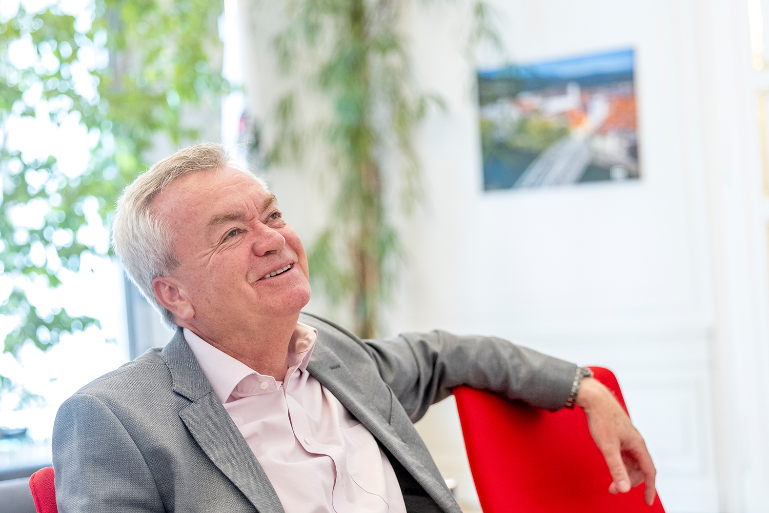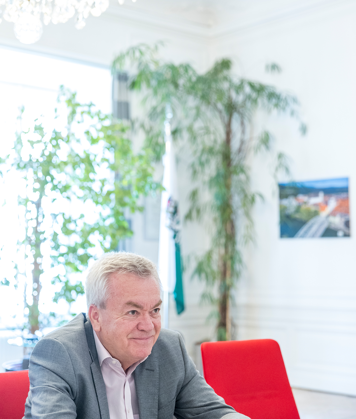 Anton Lang arbeitet in einem etwa 60 Quadratmeter großen Büro. Er hat es 2019 von Michael Schickhofer übernommen, der es wiederum von seinem Vorgänger Franz Voves geerbt hatte. Das Mobiliar ist seit damals gleichgeblieben. Voves hatte »seine« Büroflucht ebenso aufwendig wie nachhaltig renovieren lassen. Geändert haben sich die Bilder, die die Wände zieren. Denn Regierungsbüros sind Orte, an denen für andere gearbeitet wird, was den Raum für Individualität in der Einrichtung beschränkt.
