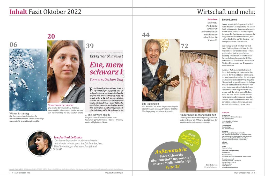 Heute ist das neue Fazit erschienen. Fazitthema »Winter is coming« Die Energiepreisexplosion hat die Unternehmen erreicht. Unsere Wirtschaft wappnet sich gegen Energieausfälle. Ein Text von Johannes Roth. Fazitgespräch Sprachrohr der Armut Die Caritas-Direktorin Nora Tödtling-Musenbichler über Armut, Solidarität und den Reformbedarf der katholischen Kirche. Fazitessay … und schwarz bist du Maryam Laura Moazedi darüber, dass […]