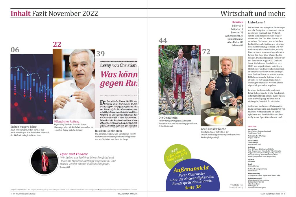Gestern ist das neue Fazit erschienen. Fazitthema Rezession Nach schwierigen Zeiten wird es nun noch schwieriger. Ein deutlicher Einbruch der Weltwirtschaft steht ins Haus. Ein Text von Johannes Roth. Fazitgespräch Öffentlicher Auftrag Kages-Chef Gerhard Stark ist davon überzeugt, dass die Wahrheit zumutbar ist – auch in Bezug auf die Spitäler. Fazitessay Was können die EU-Sanktionen […]