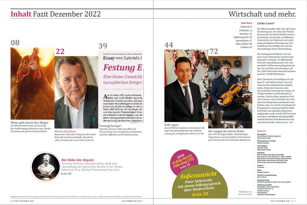 Heute ist das neue Fazit erschienen. Fazitthema Erderwärmung Der Klimawandel wirkt sich auch auf die Ernährungsgewohnheiten aus. Starker Fleischkonsum gilt als klimaschädlich. Ein Text von Johannes Roth. Fazitgespräch Warm anziehen! Baumeister Alexander Pongratz über harte Zeiten für die Bauwirtschaft, obwohl die »Neue Gründerzeit« noch nicht vorbei ist. Fazitessay Festung Europa? Historikerin Gabriele Clemens wirft einen […]