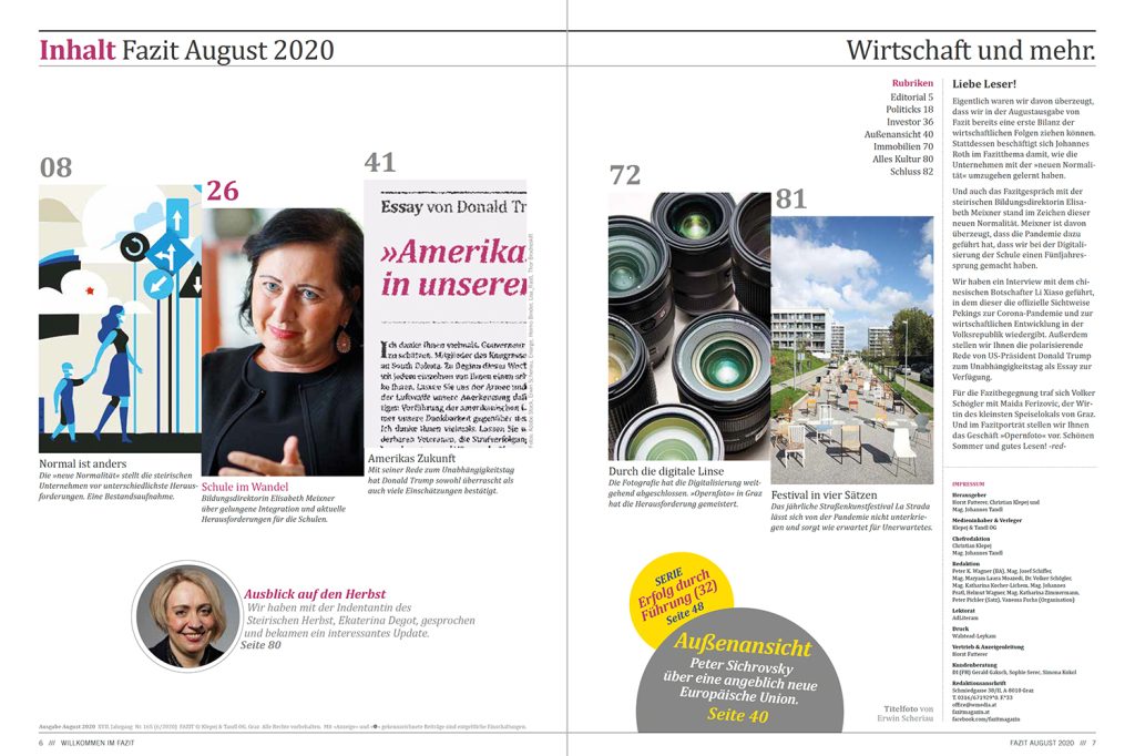 Heute ist das neue Fazit erschienen. Fazitthema Normal ist anders Die »neue Normalität« stellt die steirischen Unternehmen vor unterschiedlichste Herausforderungen. Johannes Roth macht sich an eine Bestandsaufnahme. Fazitgespräch Schule im Wandel Die steirische Bildungsdirektorin Elisabeth Meixner über gelungene Integration und aktuelle Herausforderungen für die Schulen. Fazitbegegnung Kleine Oase Volker Schögler hat sich mit Maida Ferizovic, […]