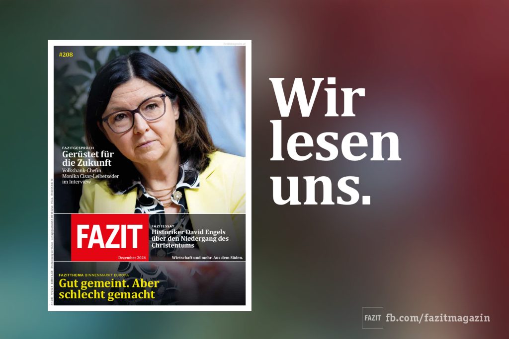 Gestern ist das neue Fazit erschienen. Fazitthema Gut gemeint. Aber schlecht gemacht Österreich ist Riesengewinner des EU-Binnenmarktes. Doch obwohl dieser weiterentwickelt werden müsste, tut sich nichts. Ein Text von Johannes Roth. Fazitgespräch Gerüstet für die Zukunft Volksbank-Chefin Monika Cisar-Leibetseder blickt auf ein Rekordjahr zurück. Mit den Zinsen sind auch die Gewinne zurück. Mit ihr sprachen […]