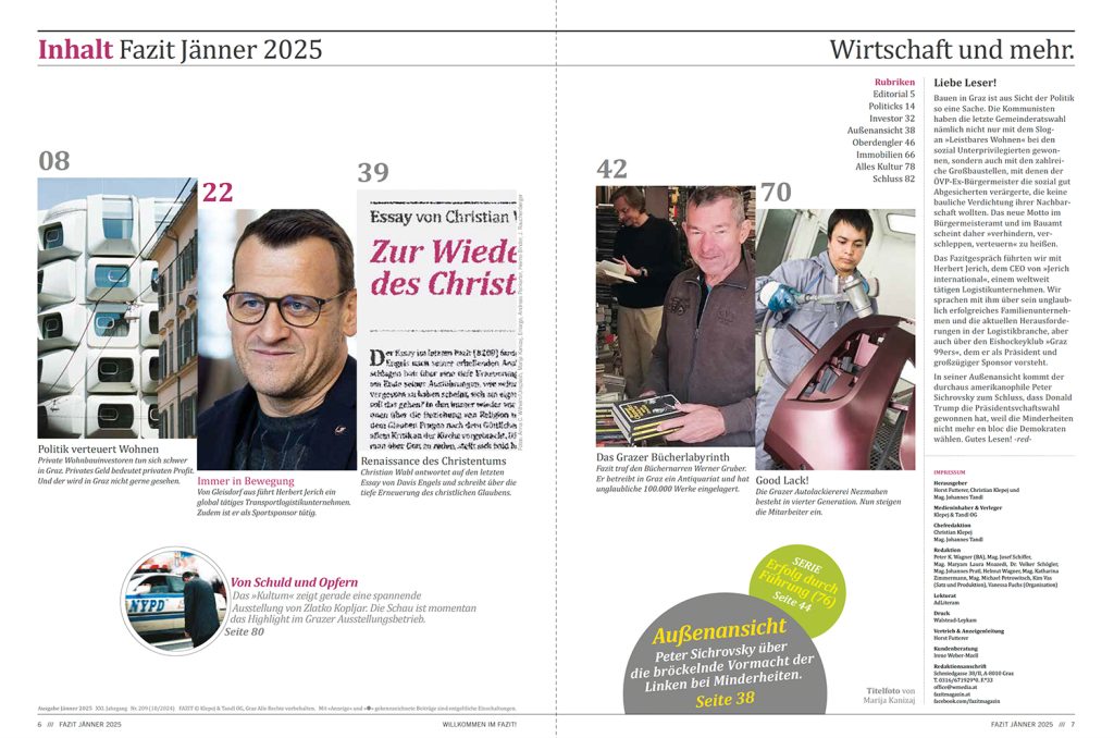 Von Gleisdorf aus führt Herbert Jerich ein global tätiges Transportlogistikunternehmen. Mit ihm haben wir uns fürs Fazitgespräch der letzten Ausgabe in diesem Jahrgang getroffen. Im Fazitthema geht es ums Bauen in Graz und wir zeigen auf, dass die Kommunisten das Wohnen in der Landeshauptstadt teurer machen. Coverfoto von Marija Kanizaj.