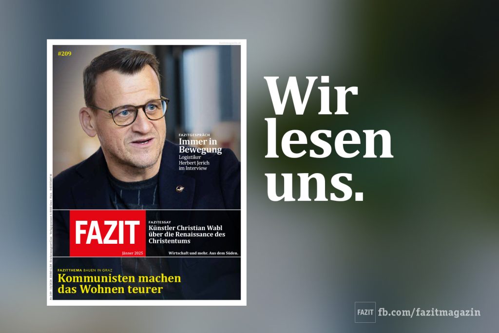 Gestern ist das neue Fazit erschienen. Fazitthema Bauen in Graz Kommunisten machen das Wohnen teurer! Private Wohnbauinvestoren tun sich schwer in Graz. Privates Geld bedeutet privaten Profit. Und der wird in Graz nicht gerne gesehen. Ein Text von Johannes Roth. Fazitgespräch Immer in Bewegung Von Gleisdorf aus führt Herbert Jerich ein global tätiges Transportlogistikunternehmen. Zudem […]