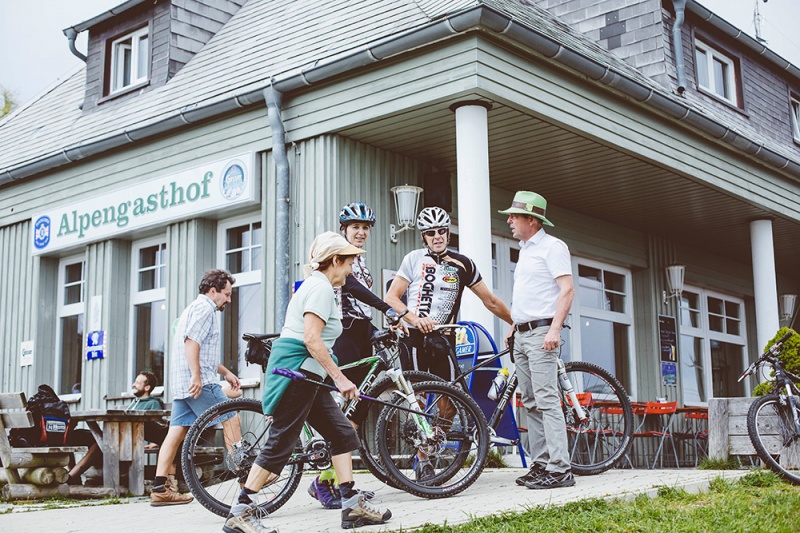 Da sind aber eben noch ganz andere Gründe, die den Schöckl immer beliebter machen, was man nicht zuletzt an den Zahlen der Seilbahn ablesen kann. Im langjährigen Schnitt gondeln 160.000 Gäste den Berg hinauf und hinunter, Tendenz steigend. Michael Krainer: »Allein zwischen Jänner und August des heurigen Jahres wurden 124.111 Personen befördert, das sind um 19.512 mehr als 2013.« Im August verbuchten die Bergfahrten gegenüber dem Durchschnitt aus den Jahren 2007 bis 2013 ein Plus von 3 Prozent, die Talfahrten eines von 10 Prozent, was ein Durchschnittsplus von 6 Prozent ergibt. Berg- und Talfahrten halten sich insgesamt ungefähr die Waage, interessanterweise gleichen sich die Zahlen der Wintersaison zwischen 1. Oktober und 30. April jenen der Sommersaison an, was gegen einen Ausbau des Ski-Angebots spricht, aber dafür, dass der Weg, aus dem Schöckl keinen Eventberg zu machen, der richtige ist. Statt einen kurzlebigen Hexenberg-Hype zu konstruieren, setzte die Graz Holding in Abstimmung mit den Grundeigentümern wie Ulrich Stubenberg eindeutig auf sanften Tourismus. Schon die »Downhill«-Europameisterschaft 2003 auf dem Schöckl war ein Anstoß in diese Richtung. Die Schöckl-Trail-Area (»die Streif der Downhiller«) oder der 38 km lange Schöckl-Panorama-Rundradweg ziehen in der Folge eben Fahrradfahrer und nicht Motorradfahrer an; am Schöckl-Plateau finden sich mittlerweile neben einem Disc-Golf-Parcours (Zielschießen mit Frisbee-Scheiben) und einer Orientierungslaufstrecke für Sportliche dank der »Lebenshilfe« auch »Wege für alle«, ein barrierefreier, dreieinhalb Kilometer langer Rundweg für Rollstuhl, Kinderwagen und Rollator (übrigens auch zu den erwähnten drei Gasthäusern) sowie eine Wohlfühlzone mit Kräuterpfad; nicht zu vergessen: die Sommerrodelbahn Hexenexpress – und nicht zuletzt steht der Schöckl natürlich für 40 km Wander- und Spazierwege. Da wurde doch glatt einmal versucht, das unerträglich hohle Wort »Nachhaltigkeit« mit Inhalt zu füllen. Wenn am Schöckl die Sonne untergeht – sieht das Simon Klasnic meistens gar nicht. Denn der Alpengasthof sperrt erst um 21 Uhr zu. Früher sei er oft mit dem Auto auf den Schöckl gefahren, dann abwechselnd mit der Gondel. Und heute? Heute geht er vier- bis fünfmal pro Woche zu Fuß von der Schöcklkreuz-Kapelle weg. Die 300 Höhenmeter schafft er mittlerweile in einer halben Stunde: »zum schönsten Arbeitsplatz der Welt.«