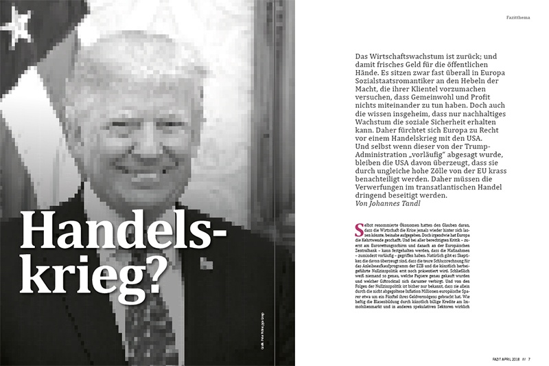 versuchen, dass Gemeinwohl und Profit nichts miteinander zu tun haben. Doch auch die wissen insgeheim, dass nur nachhaltiges Wachstum die soziale Sicherheit erhalten kann. Daher fürchtet sich Europa zu Recht vor einem Handelskrieg mit den USA. Und selbst wenn dieser von der Trump-Administration »vorläufig« abgesagt wurde, bleiben die USA davon überzeugt, dass sie durch ungleiche hohe Zölle von der EU krass benachteiligt werden. Daher müssen die Verwerfungen im transatlantischen Handel dringend beseitigt werden. Text von Johannes Tandl.
