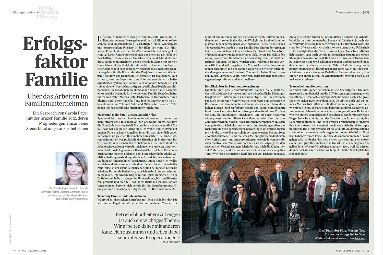 Über das Arbeiten im Familienunternehmen. Ein Gespräch von Carola Payer mit der Grazer Familie Totz, deren Mitglieder gemeinsam eine Steuerberatungskanzlei betreiben.