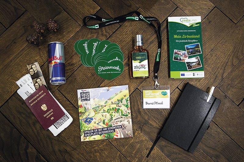 Die Zirbe hat zentralen Stellenwert für das Leben von Touristiker Bernd Pfandl, der in Fisching nahe Judenburg einen Campingpark für Gäste über 50 betreibt. Auch Businessappartements und eine Cocktailbar namens Plaschkothek gehören zum Tourismusbetrieb, in dem von April bis Oktober viel los ist. »Wir haben viele Gäste aus Holland oder Deutschland und sie lieben die Region«, sagt Pfandl. Zu seinen Essentials gehören auch viele typische Produkte aus dem Zirbenland: »Eine Notration Zirbenschnaps habe ich immer dabei, das ist ein wahres Lebenselixier und wirkt bei mir wie bei Asterix der Zaubertrank,« erklärt er die Flasche »Zirberl«. Auch die Zirbenzapfen sind in Pfandls Leben allgegenwärtig, denn sie beruhigen und sind ein Symbol für die Heimat. Und wenn es ums Zirbenland geht, dann ist auch »Mein Zirbenland«, der Reiseführer über die Region, ein Muss.