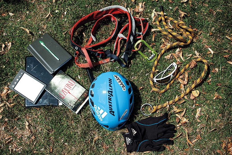 Zuerst kam das Slacklinen (eine Form von Seiltanzen), Kleindl war einer der Pioniere in der Grazer Szene. Bereits seit zehn Jahren balanciert er von Baum zu Baum und mittlerweile hauptsächlich von Fels zu Fels, denn es ist die »High Line«, die ihn fasziniert. Egal ob er jetzt über die Mur oder die Victoria-Wasserfälle geht – Slacklinen macht Reinhard Kleindl glücklich. Dafür braucht er auch den Klettergurt der Marke Black Diamond. »Eigentlich versuche ich mich beim Sturz immer abzufangen, deswegen sind auch die Handschuhe mit dabei«, beschreibt er seine Technik. Damit die Handschuhe auch bei großer Hitze angenehm zu tragen sind, hat er sich das leichteste Modell ausgesucht. Aktuell hält Kleindl den österreichischen Rekord für die »Long Line«, dieser wurde in der Weststeiermark aufgestellt. Wo genau, verrät Kleindl nicht. Bei allen Slacklineabenteuern hat der Sportler auch immer die Leash dabei, das ist die Sicherheitsleine, an der sein Leben hängt. »Genial ist der Karabiner, der eigens für das Slacklinen entworfen wurde und gleichzeitig ein Kugellager hat, mit dem man zurückrollen kann, wenn einem die Energie ausgeht«, sagt Kleindl, der als Sponsor schon seit mehreren Jahren auf Adidas setzt. Unschwer ist das an der weißen Sportbrille und dem knallblauen Helm zu erkennen. Vom Nationalpark Yosemite in Kalifornien über den Kinabalu in Borneo bis zu den drei Zinnen in Südtirol spannte er seine Slackline und spazierte scheinbar problemlos darüber.