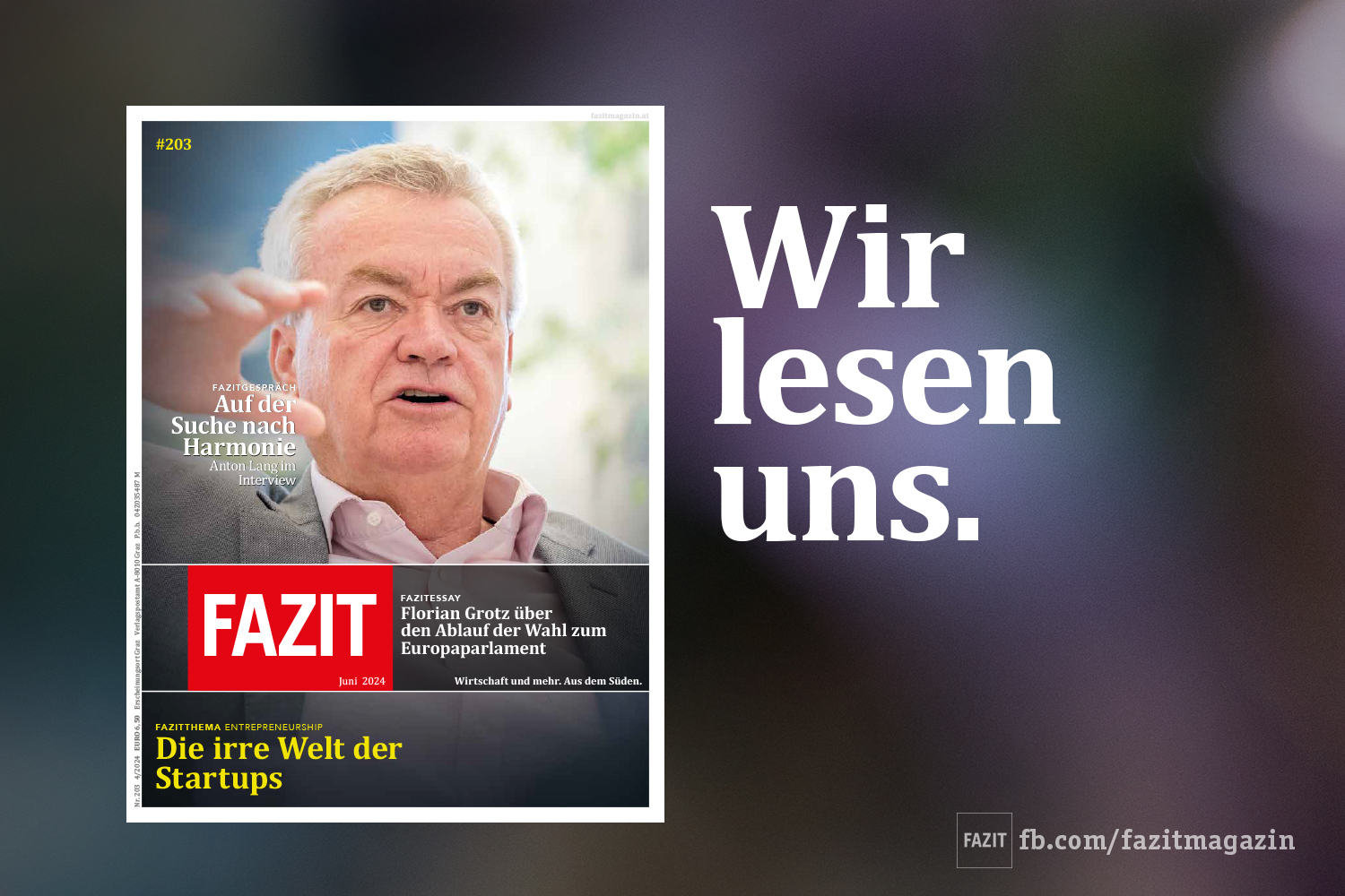 Startups kommen aus dem Nichts und machen – zumindest wenn alles gut geht – innerhalb weniger Jahre Millionenumsätze. Dahinter steht oft lediglich eine gute und neue Idee. Und bei den Fazitgesprächen anlässllich der Landtagswahl ist diesmal SPÖ-Chef und Landeshauptmannstellvertreter Anton Lang an der Reihe. Das und mehr im Fazit 203! Bald auch online verfügbar. Coverfoto von Erwin Scheriau.