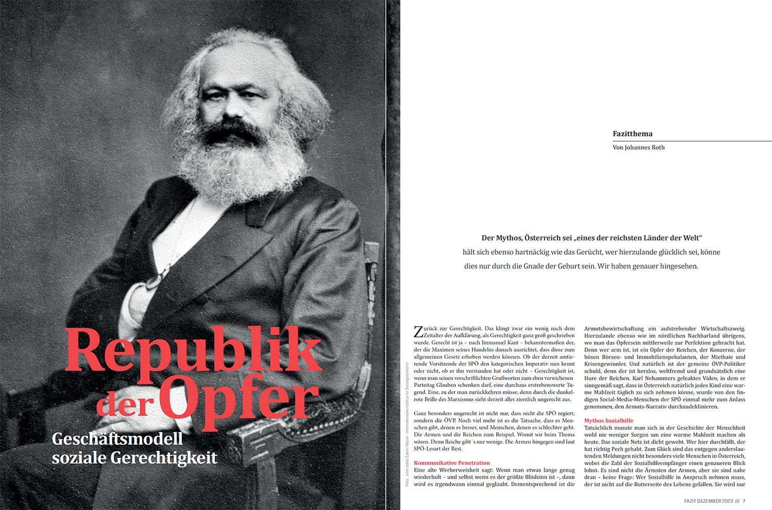 Fragt man Ultralibertäre, wie den neu gewählten argentinischen Präsidenten Javier Milei, ist die Antwort eindeutig: Lassen Sie sich nicht vom Sirenengesang der sozialen Gerechtigkeit verführen! Und glauben Sie nicht, wenn Ihnen jemand sagt: Dort, wo es einen Bedarf gibt, gibt es auch ein Recht darauf, rät er. Seine Ansichten fallen in Argentinien auf fruchtbaren Boden, denn dort haben jahrzehntelang sozialistische Politiker versucht, das im Staat erwirtschaftete Vermögen mehr oder weniger gerecht zu verteilen – mit dem Ergebnis, dass Argentinien nun wirtschaftlich und sozial am Ende seiner Kräfte ist. Javier Milei ist quasi der Kontrapunkt zu heimischen Populisten, die behaupten, die soziale Gerechtigkeit ließe sich nur herstellen, wenn man Vermögen besteuere und den Leistungsgedanken so weit wie möglich zurückdränge. Anpfiff für Gerechtigkeit übertitelt die SPÖ ihren Forderungskatalog, der Rechte für jede Problemstellung individueller Lebensorganisation einfordert: Ein gerechter SPÖ-Vollkaskostaat solle eine Ordnung herstellen, die den einzelnen von der Verantwortung enthebt, sich um sich selbst zu kümmern. Denn so, wie es jetzt sei, seien alle Menschen in irgendeiner Form entrechtete Opfer eines bösen, entmenschlichenden Kapitalismus, der für Armut und Ungleichheit sorgt: Das Recht auf einen Facharzttermin wird hier eingefordert, das Recht darauf, mit nicht mehr als zwei Prozent Preissteigerungen kalkulieren zu müssen. Opfer sind auch alle, die weniger verdienen als ein beliebiger anderer – es sei eben die Aufgabe der Politik Lohngerechtigkeit herzustellen. Opfer gibt es laut SPÖ zuhauf: Senioren, die wegen der Überlastung des Pensionssystems länger als bis 65 arbeiten werden müssen, Pflegekräfte, die von profitgierigen Organisationen ausgebeutet werden, Kinder, die in der Schule ohne warmes Mittagessen aushalten und darüber hinaus Matura machen und sich mit Ziffernnoten herumschlagen müssen.