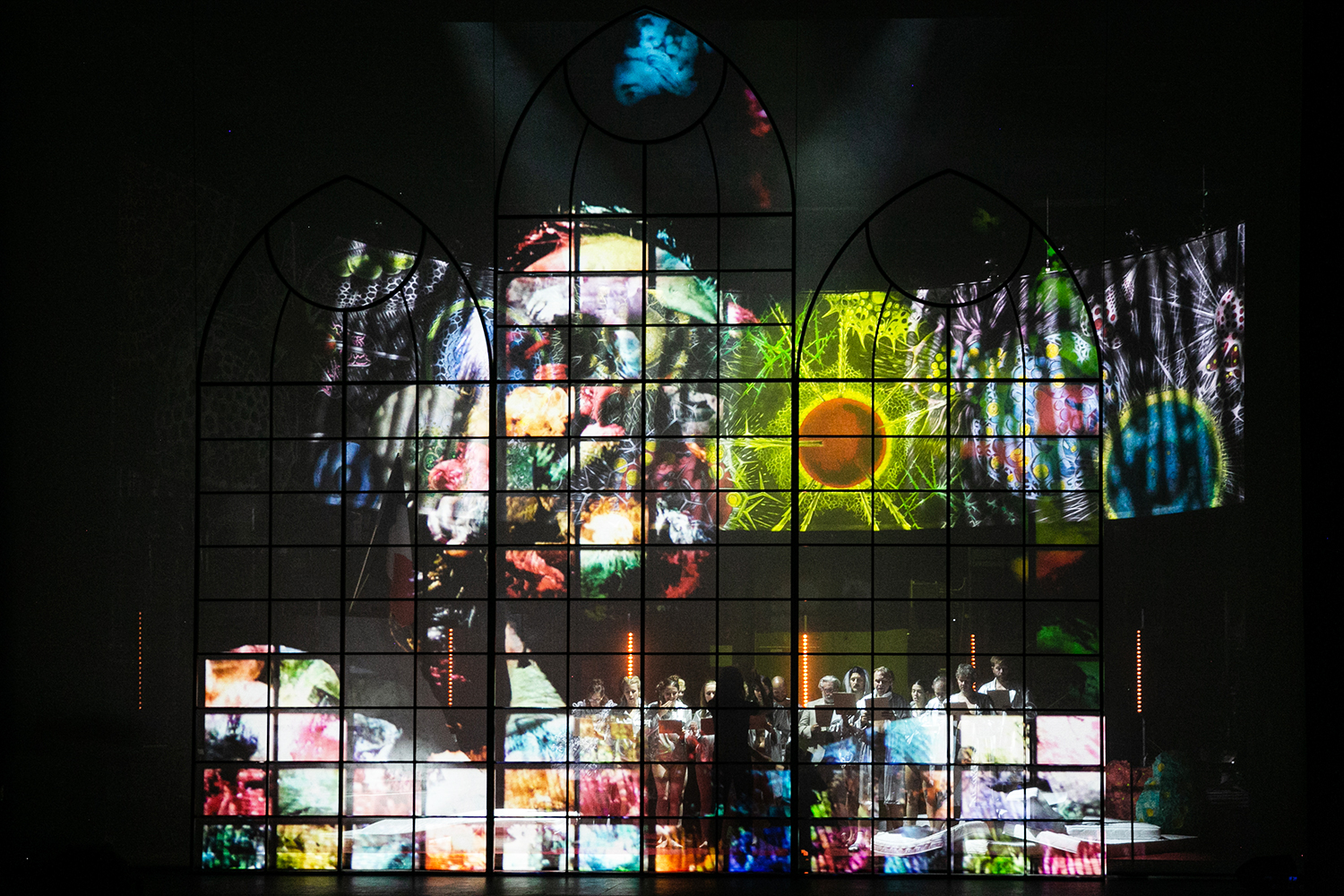 Und dabei habe ich noch nicht einmal die teilweise enthusiasmierenden Bühnenbilder gewürdigt, die sich gut dosiert die ganzen Stunden hin zu einem furiosen – natürlich wurde bei der katholischen Kirche kleine Anleihe genommen, die kann das halt – ikonographischen Finale aufladen. Besonders überrascht hat mich dabei die Tatsache, dass ich auch mit dem Einsatz von Videos und Echtzeitbildübertragungen nicht die üblichen Probleme hatte; hier findet diese technische Ergänzung einer Bühne tatsächlich begründeten, aber durch die Wirkung jedenfalls erlaubten und beinahe notwendigen Einsatz.