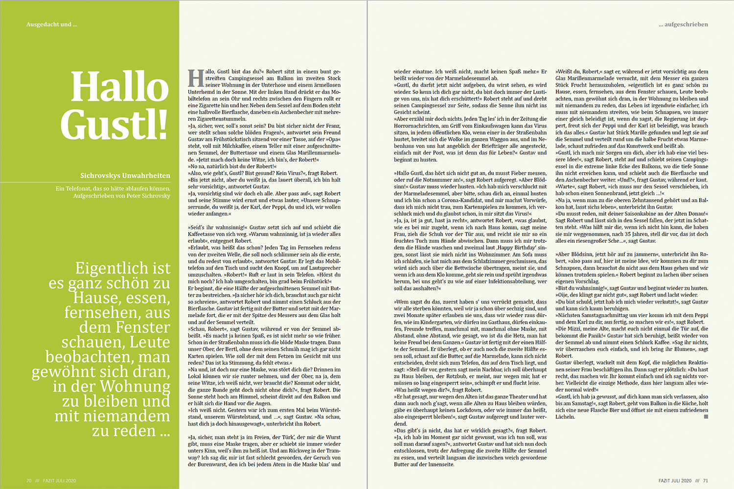 »Wem sagst du das, zuerst haben s’ uns verrückt gemacht, dass wir alle sterben könnten, weil wir ja schon über sechzig sind, und zwei Monate später erlauben sie uns, dass wir wieder raus dürfen, wie im Kindergarten, wir dürfen ins Gasthaus, dürfen einkaufen, Freunde treffen, manchmal mit, manchmal ohne Maske, mit Abstand, ohne Abstand, wie gesagt, wo ist da die Hetz, man hat keine Freud bei dem Ganzen.« Gustav ist fertig mit der einen Hälfte der Semmel. Er überlegt, ob er auch noch die zweite Hälfte essen soll, schaut auf die Butter, auf die Marmelade, kann sich nicht entscheiden, dreht sich zum Telefon, das auf dem Tisch liegt, und sagt: »Stell dir vor, gestern sagt mein Nachbar, ich soll überhaupt zu Haus bleiben, der Rotzbub, er meint, nur wegen mir, hat er müssen so lang eingesperrt sein«, schimpft er und flucht leise.