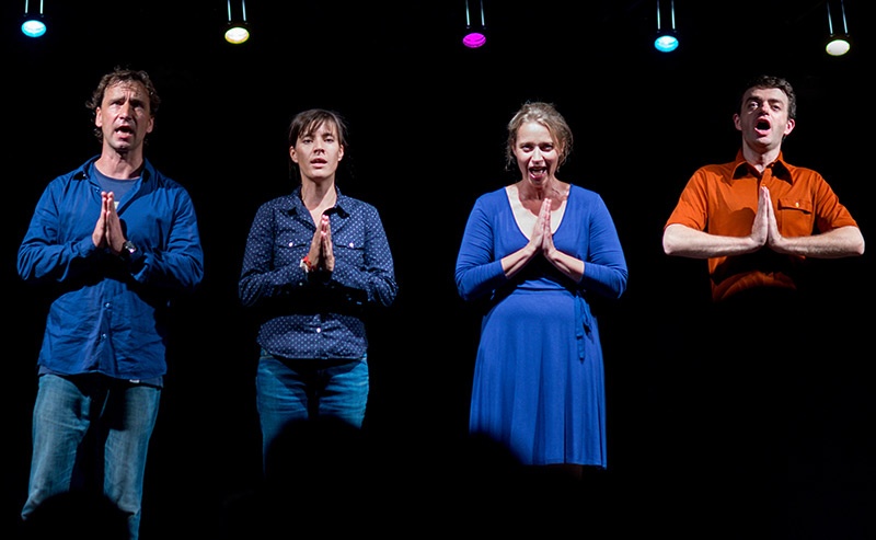 vier Schauspieler vor mehrheitlich jungem Publikum durch den Abend.