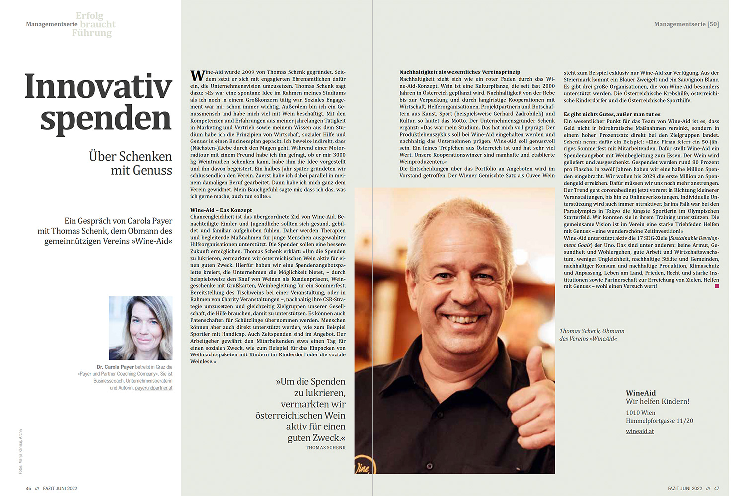 Nachhaltigkeit zieht sich wie ein roter Faden durch das Wine-Aid-Konzept. Wein ist eine Kulturpflanze, die seit fast 2000 Jahren in Österreich gepflanzt wird. Nachhaltigkeit von der Rebe bis zur Verpackung und durch langfristige Kooperationen mit Wirtschaft, Helferorganisationen, Projektpartnern und Botschaftern aus Kunst, Sport (beispielsweise Gerhard Zadrobilek) und Kultur, so lautet das Motto. Der Unternehmensgründer Schenk ergänzt: »Das war mein Studium. Das hat mich voll geprägt. Der Produktlebenszyklus soll bei Wine-Aid eingehalten werden und nachhaltig das Unternehmen prägen. Wine-Aid soll genussvoll sein. Ein feines Tröpfchen aus Österreich ist und hat sehr viel Wert. Unsere Kooperationswinzer sind namhafte und etablierte Weinproduzenten.«