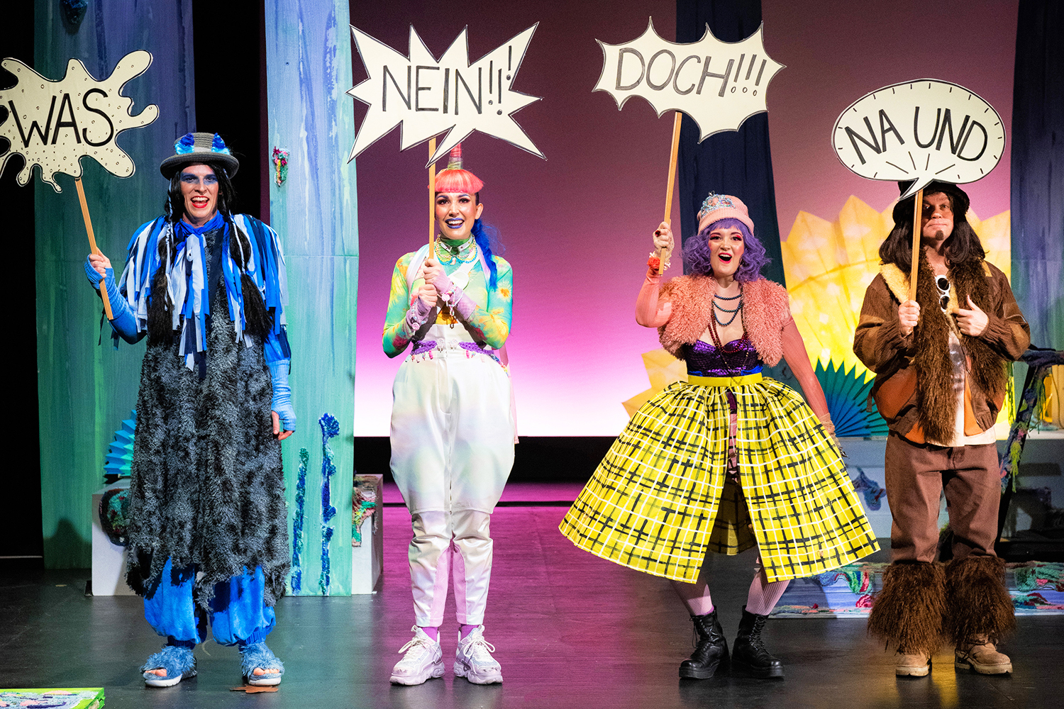 Zu viel. Ein gutes Stichwort. »Zu viel« darf man sich üblicherweise nicht erwarten, wenn Bücher, die man verschlingt, auf anderer Bühne aufgeführt werden. Das geht nämlich nur allzu gerne schief. Der Autor dieser Zeilen wusste das schon, als er mit seinem Junior im Next Liberty zu Gast war. Der Sprössling selbst nicht. Umso wundervoller war dann die Erfahrung für Groß und Klein nach der Aufführung im Grazer Jugendtheater Nummer eins. Eine sehr gelungene Mischung aus Originaltexten aus dem Buch und Bühnenadaptierungen führte zu einem ausnahmslos begeisterten Publikum. Eine Adaptierung war das mehrmals vorgetragene Lied, das Klings »Neinhorn«-Humor in wenigen Worten konzentriert auf den Punkt bringt, und im Druckwerk nicht zu finden ist: »Nein! Doch! Was? Na und! Dafür braucht es keinen Grund.« Ein Lied, das dazu führt, dass in unserem Hause seit dem Theaterbesuch neben der Bestreaderlisten auch die Hitparaden von einem gewissen Neinhorn angeführt werden.