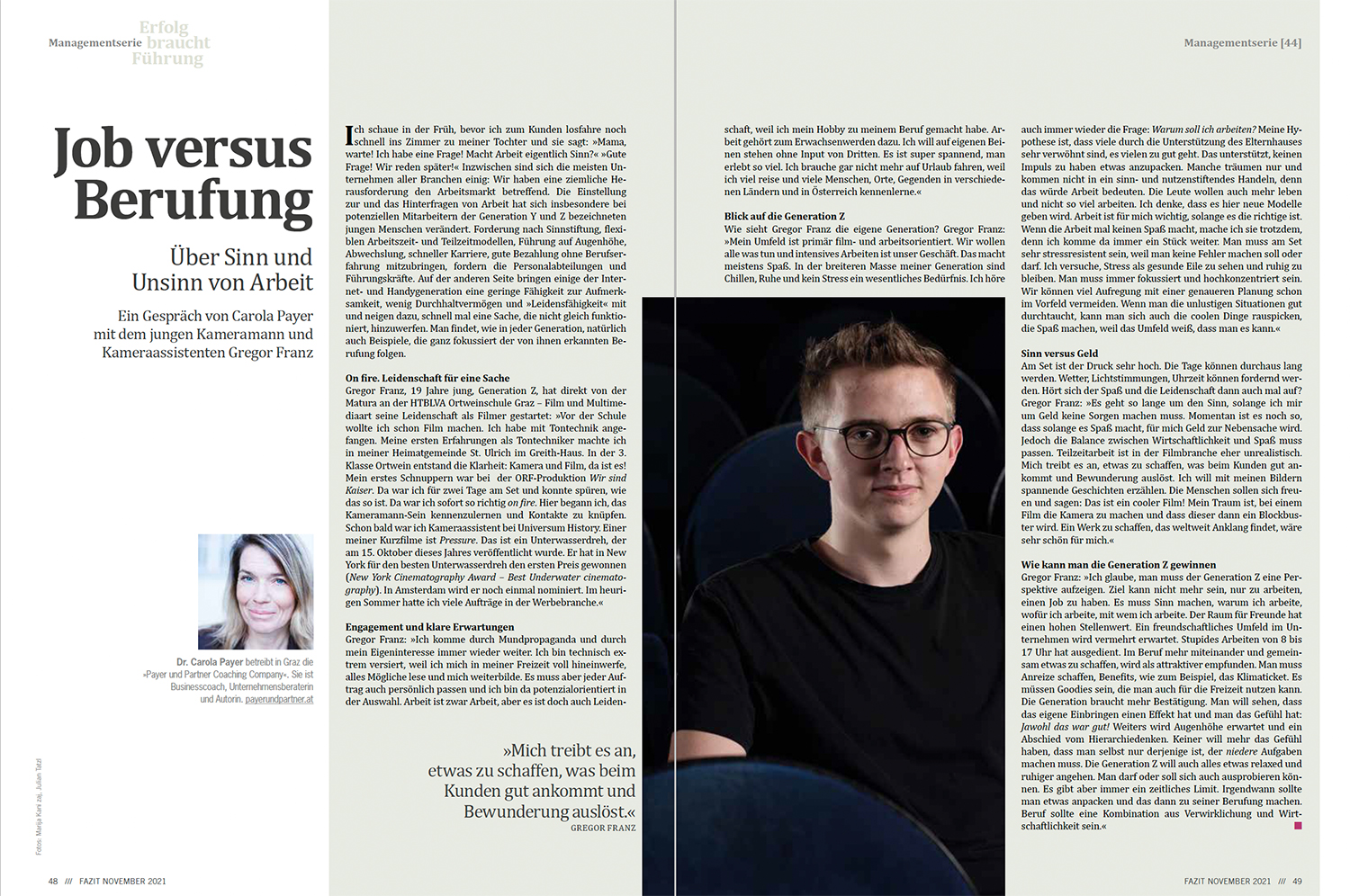 Gregor Franz: »Ich komme durch Mundpropaganda und durch mein Eigeninteresse immer wieder weiter. Ich bin technisch extrem versiert, weil ich mich in meiner Freizeit voll hineinwerfe, alles Mögliche lese und mich weiterbilde. Es muss aber jeder Auftrag auch persönlich passen und ich bin da potenzialorientiert in der Auswahl. Arbeit ist zwar Arbeit, aber es ist doch auch Leidenschaft, weil ich mein Hobby zu meinem Beruf gemacht habe. Arbeit gehört zum Erwachsenwerden dazu. Ich will auf eigenen Beinen stehen ohne Input von Dritten. Es ist super spannend, man erlebt so viel. Ich brauche gar nicht mehr auf Urlaub fahren, weil ich viel reise und viele Menschen, Orte, Gegenden in verschiedenen Ländern und in Österreich kennenlerne.«