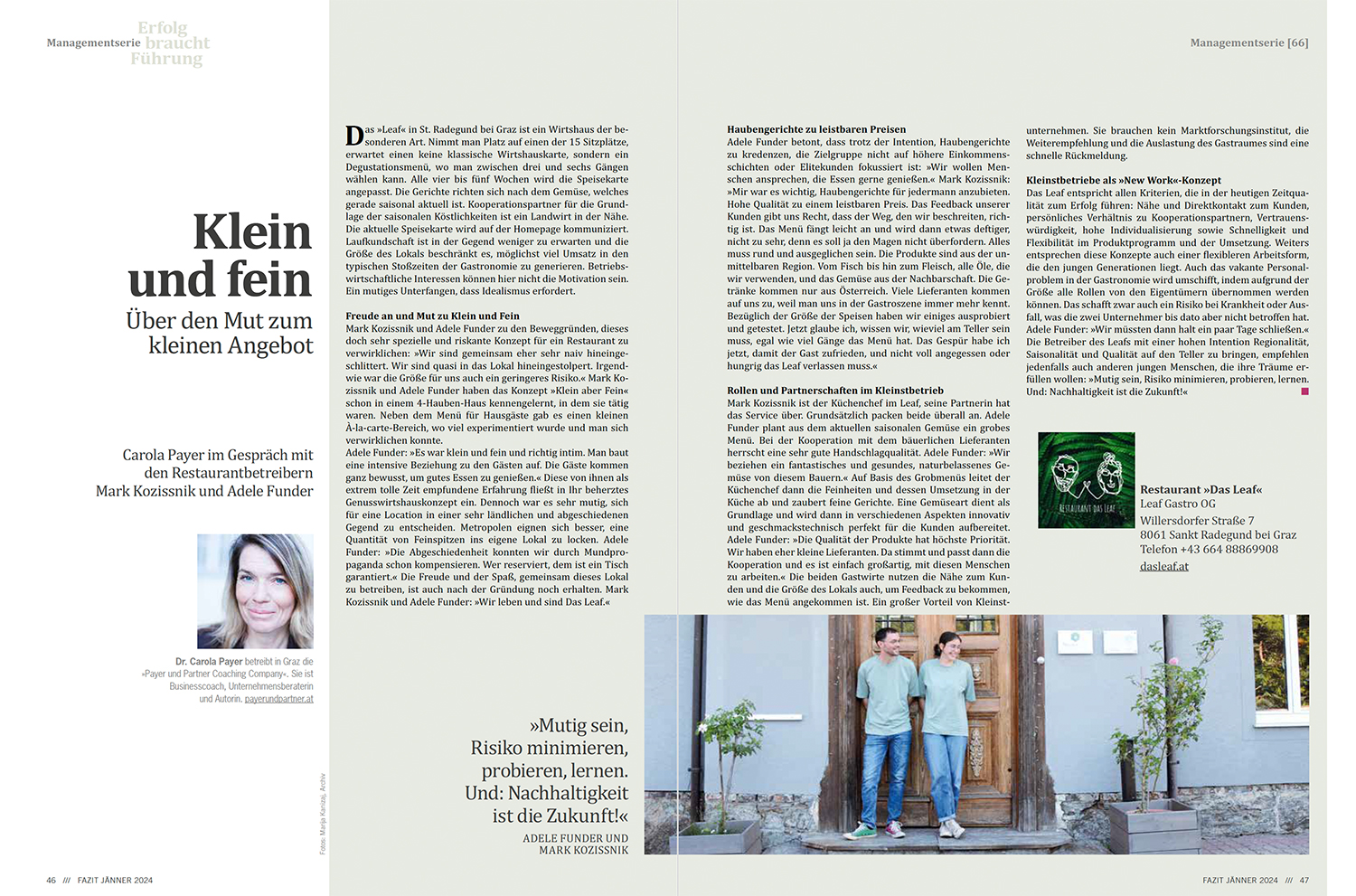 Das Leaf entspricht allen Kriterien, die in der heutigen Zeitqualität zum Erfolg führen: Nähe und Direktkontakt zum Kunden, persönliches Verhältnis zu Kooperationspartnern, Vertrauenswürdigkeit, hohe Individualisierung sowie Schnelligkeit und Flexibilität im Produktprogramm und der Umsetzung. Weiters entsprechen diese Konzepte auch einer flexibleren Arbeitsform, die den jungen Generationen liegt. Auch das vakante Personalproblem in der Gastronomie wird umschifft, indem aufgrund der Größe alle Rollen von den Eigentümern übernommen werden können. Das schafft zwar auch ein Risiko bei Krankheit oder Ausfall, was die zwei Unternehmer bis dato aber nicht betroffen hat. Adele Funder: »Wir müssten dann halt ein paar Tage schließen.« Die Betreiber des Leafs mit einer hohen Intention Regionalität, Saisonalität und Qualität auf den Teller zu bringen, empfehlen jedenfalls auch anderen jungen Menschen, die ihre Träume erfüllen wollen: »Mutig sein, Risiko minimieren, probieren, lernen. Und: Nachhaltigkeit ist die Zukunft!«
