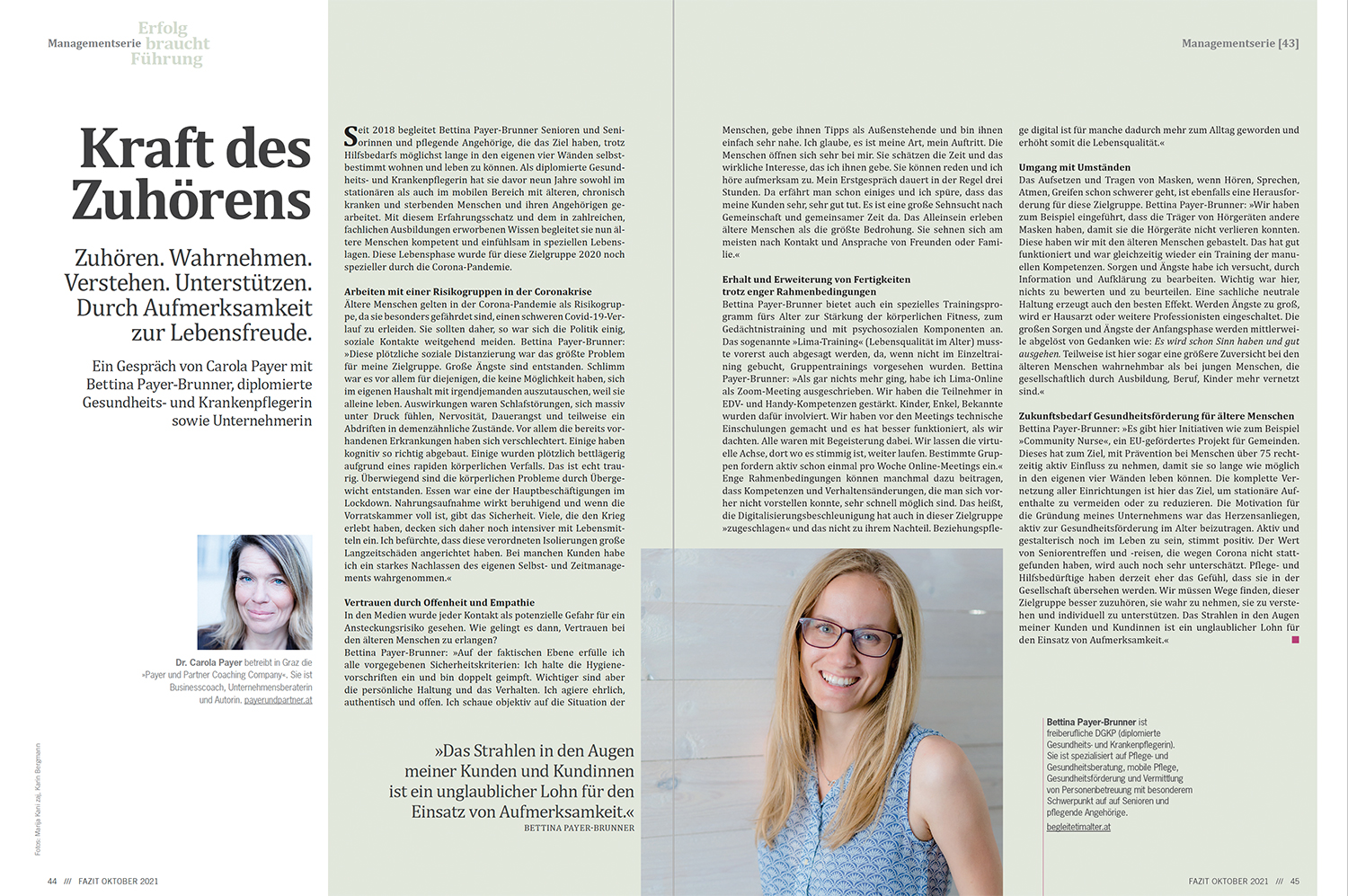 Zuhören. Wahrnehmen. Verstehen. Unterstützen. Durch Aufmerksamkeit zur Lebensfreude. Ein Gespräch von Carola Payer mit Bettina Payer-Brunner, diplomierte Gesundheits- und Krankenpflegerin sowie Unternehmerin.