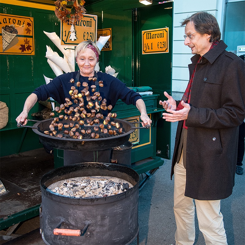 Heuer ist es erst Mitte November kalt geworden – schlecht fürs Geschäft? »Nein, gar nicht«, sagt die Maronifrau mit dem für sie charakteristischen Stirnband, »heute werden Maroni auch gegessen, wenn es 15, 18 oder 20 Grad hat.« Die ersten, die Maroni nach Österreich gebracht haben, waren vor ziemlich genau 100 Jahren die Italiener. Ganz vorne mit dabei war ein gewisser Alfonso Bulliano, Konditormeister aus Breda di Piave bei Treviso im italienischen Veneto, der unter anderem auf der Radetzkybrücke seine Ware feilbot. Aus Bulliano wurde Bulian, der Sohn hieß Anton, dessen Frau Anna; sie waren die Eltern von Sabina und führten ab Mitte der 1960er Jahre den legendären Eissalon Bulian in der Lazarettgasse 37.