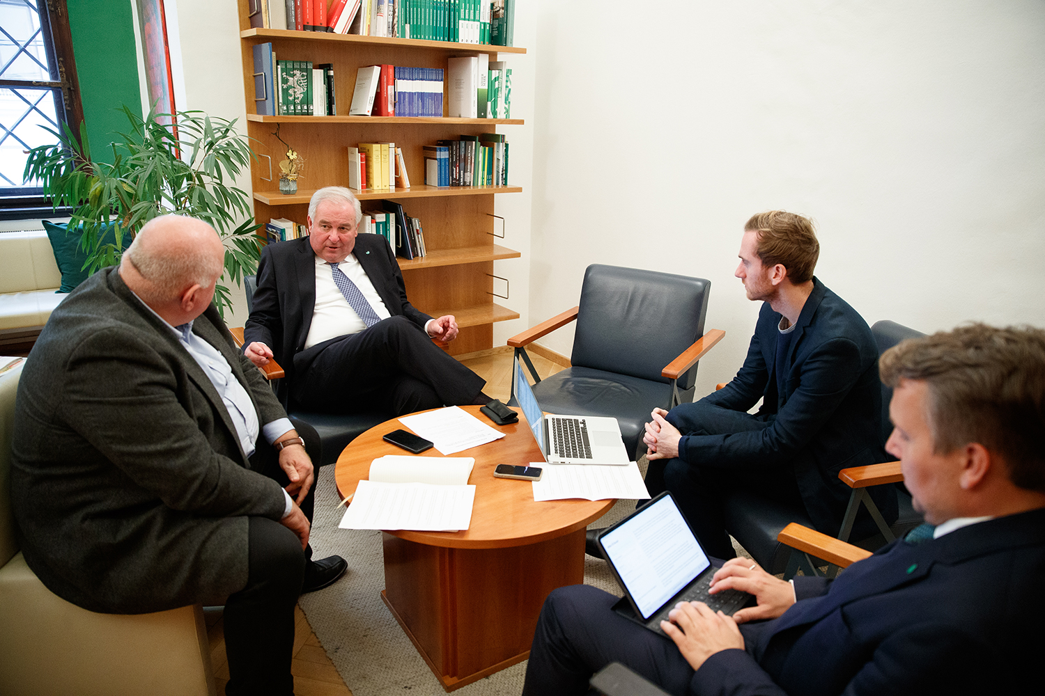 Nun bietet er uns etwas zu trinken an. »Bier? Wein?«, meint er scherzhaft. »Ich trinke nicht um die Uhrzeit, aber ihr könnt gerne.« Es ist kurz vor 11 Uhr am Vormittag, nebenan wird bereits das Büffet für die Landtagsabgeordneten vorbereitet und Schützenhöfer ist trotz Terminstress und Wahlkampf sichtlich gut gelaunt.