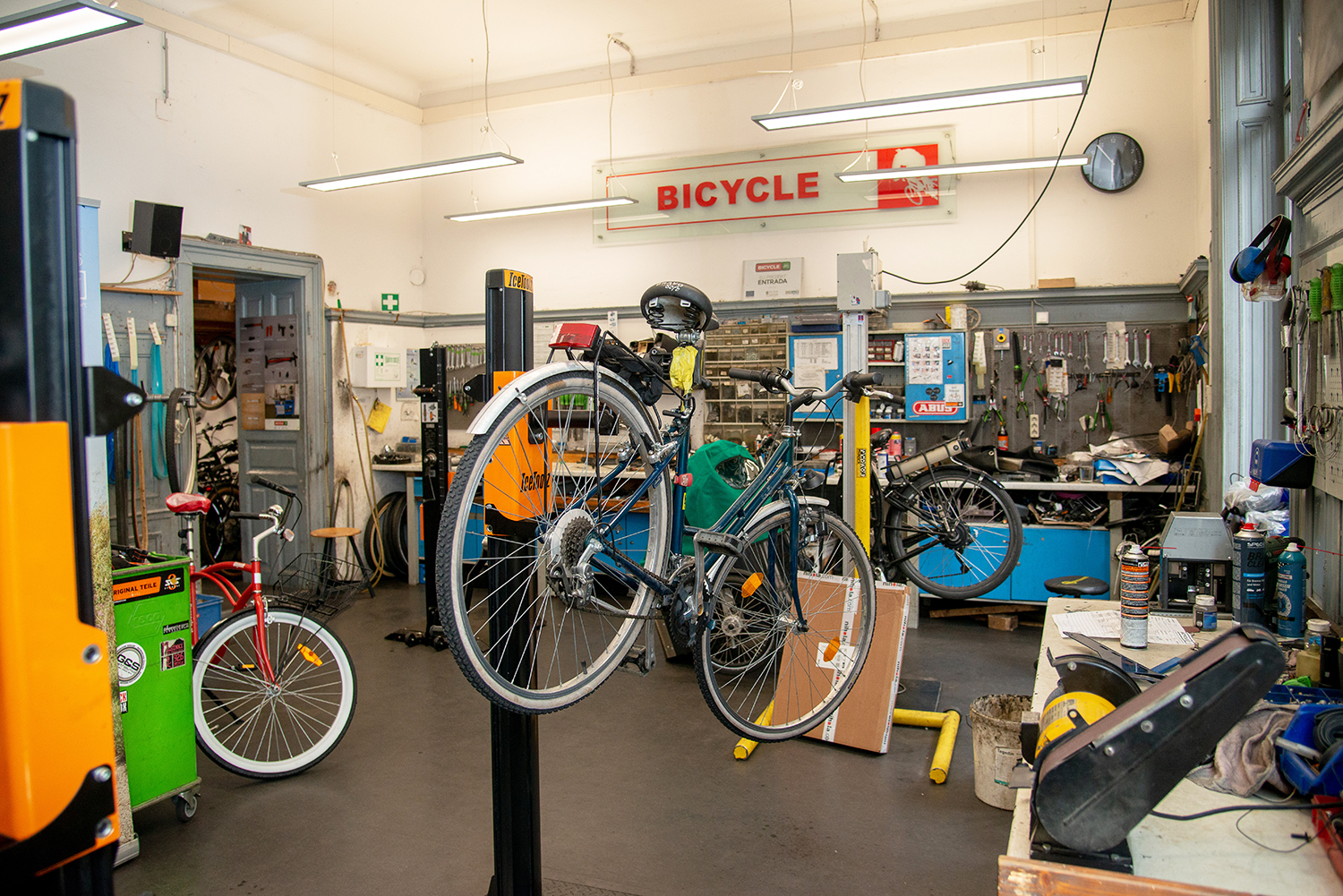 In der Körösistraße 17, wo auf 180 Quadratmetern Verwaltung und Sozialpädagogik untergebracht sind und der Fahrradverleih abgewickelt wird, befinden sich ein Außenwaschplatz für Selberputzer und als besonderes Highlight eine Fahrradwaschanlage, die den Einsatz von 6 Euro wirklich lohnt. Sie ist auch mobil einsetzbar und kann für Veranstaltungen gemietet werden. Unentgeltlich ausborgen kann man sich hier auch ein Lastenrad, das sogenannte »Grätzlrad«. Ganz in der Nähe, am Schwimmschulkai, werden auf weiteren 200 Quadratmetern alte Fahrräder und gebrauchte Fahrradteile in einer eigenen Werkstätte aufbereitet und online zum Kauf angeboten. So stellt Bicycle für Gebraucht- räder und Fahrradteile eine weitere Nutzung sicher, ganz im Sinne einer ökologischen Kreislaufwirtschaft. Die alten Fahrräder kommen meist von Hausverwaltungen, die »Kellerleichen« entsorgen oder vom Fundamt der Stadt. »Sicherheitshalber werden diese Räder aber zwei Monate aufbehalten, falls sich doch noch ein Besitzer meldet«, so Kronheim. Aus diesem Fundus werden auch gemeinnützigen Organisationen Fahrräder zur Verfügung gestellt. Pro Jahr werden hier etwa 200 bis 300 Gebrauchträder hergerichtet. Ein anderes Verkaufsprodukt des Vereins Bicycle sind Fahrradserviceboxen. Diese werden seit Jahren in Eigenregie produziert und können nach Kundenwunsch auch farblich und ausstattungstechnisch gestaltet werden. Darin enthalten sind ein Kompressor zum Reifenaufpumpen und Werkzeug (15er und 13er Gabelschlüssel, ein Kreuzschraubenzieher, ein Imbussatztool, ein Ölfläschchen, eine Zange sowie Reifenheber, jeweils übrigens angekettet), damit Radfahrer sich selbst bei Radpannen behelfen können. Zu den Kunden für die Boxen zählen etwa Gemeinden, Stadt Graz, Energie Graz, der Landesschulrat Steiermark, die Uni Graz, die TU Graz oder Joanneum Research. Bicycle bietet auch ein mobiles Fahrradservice für Firmen und Institutionen an und kommt auf Wunsch zu deren Betriebstätten, um die Fahrräder der Mitarbeiter vorort zu servicieren.