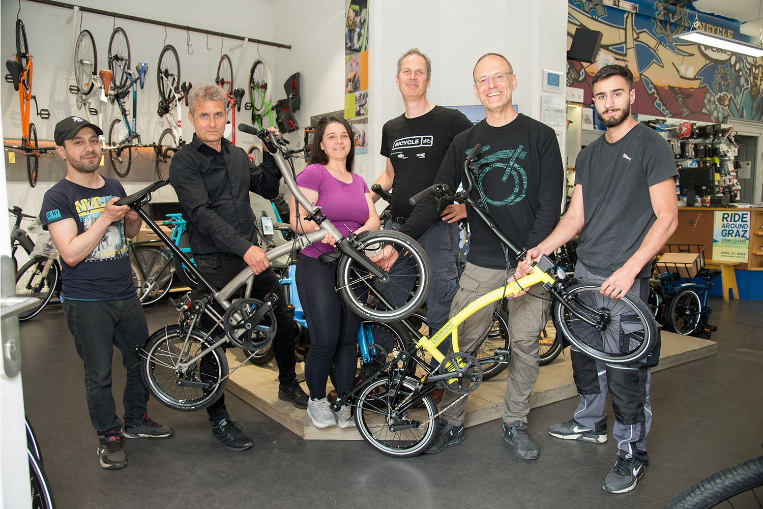 Per definitionem ist der Verein ein vom Arbeitsmarktservice (AMS), der Stadt Graz, dem Land Steiermark und vom Europäischen Sozialfonds (ESF) geförderter sozialökonomischer Beschäftigungsbetrieb, der langzeitarbeitslosen Menschen Arbeitsplätze, Arbeitstraining sowie soziale Betreuung und Qualifizierung auf Zeit bietet. Das Jahresbudget beträgt zirka 1,5 Millionen Euro, wovon mittlerweile bereits 60 Prozent vom Verein selbst erwirtschaftet werden. Das geschieht an insgesamt fünf Standorten, in erster Linie aber über die zwei Fahrradgeschäfte in der Körösistraße 5 mit 350 Quadratmetern und der Rechbauerstraße 57 mit 190 Quadratmetern. Dort erfolgen die Reparatur der Fahrräder sowie der Handel mit Neurädern, Teilen und Zubehör. Zusätzlich wird die Produktionsabwicklung von Eigenbranding-Fahrrädern angeboten. Dabei werden Firmenräder mit Logo und Farbgestaltung individuell für größere Fahrradstückzahlen mit Hilfe eines deutschen Produzenten hergestellt. Im Stadtbild bekannt sind etwa die rotweißen Fahrräder der TU Graz. Kronheim: »So können wir für diese Kunden Fahrräder vergleichsweise um rund 100 Euro günstiger anbieten.« Das Hauptziel ist aber, dass die ausschließlich vom AMS auf die Transitarbeitsplätze zugewiesenen Personen nachher besser wissen, was sie können und wo ihre Stärken liegen, im Idealfall auch eine Ausbildung machen und einen Job bekommen. Und dass sie ihre allfälligen Schulden-, Drogen-, Alkohol- oder Wohnungsprobleme gelöst oder wesentlich verbessert haben. Kronheim: »Dabei werden sie von unseren Sozialpädagogen unterstützt, die ihnen sagen: Du bist jetzt ein halbes Jahr bei uns, wir bieten dir eine geregelte Arbeit, ein fixes Dienstverhältnis und ein fixes Einkommen. Du kannst diese Zeit nutzen, um deine Lebenssituation und vor allem deine Arbeitsmarktintegrationschancen zu verbessern.« Bicycle hilft bei der Wohnungssuche, vermittelt Schuldnerberatung und bietet jedem, der schlecht deutsch spricht Deutschkurse an, zumal rund die Hälfte der Teilnehmer einen Migrationshintergrund hat. Voraussetzung für einen Transitarbeitsplatz bei Bicycle ist Langzeitarbeitslosigkeit, das heißt, man muß zumindest zwölf Monate beim AMS vorgemerkt sein. Kronheim: »Im vergangenen Jahr waren die Leute im Schnitt dreieinhalb Jahre arbeitslos, bevor sie zu uns gekommen sind. Die Erfolgsquote liegt bei 30 Prozent, das ist heißt, etwa ein Drittel des bicycle-Personals findet auch wieder eine neue Arbeitsstelle.« Die durchschnittliche Aufenthaltsdauer der Transitarbeitskräfte beträgt sechs Monate und kann, wenn es individuell sinnvoll erscheint, um drei Monate verlängert werden. Ziel ist eine Frauenquote von 50 Prozent, erreicht werden durchschnittlich 40 Prozent. Seit kurzem werden auch digitale Fortbildungs- sprich Computerkurse angeboten. Auch Praktika bei anderen Firmen werden vermittelt, zum Beispiel bei einem Tischler. Gerade daraus, so Kronheim, entstünden nämlich die meisten Dienstverhältnisse. Denn es ist klar, dass nicht alle in der Fahrradbranche einen Job finden können. Der Markt in Graz wurde früher von einigen wenigen Fachgeschäften wie »Pech« oder »Sioux« abgedeckt, mittlerweile ist er stark gewachsen, zurzeit gibt es bereits mehr als 30 Fahrradreparaturwerkstätten in der Stadt.