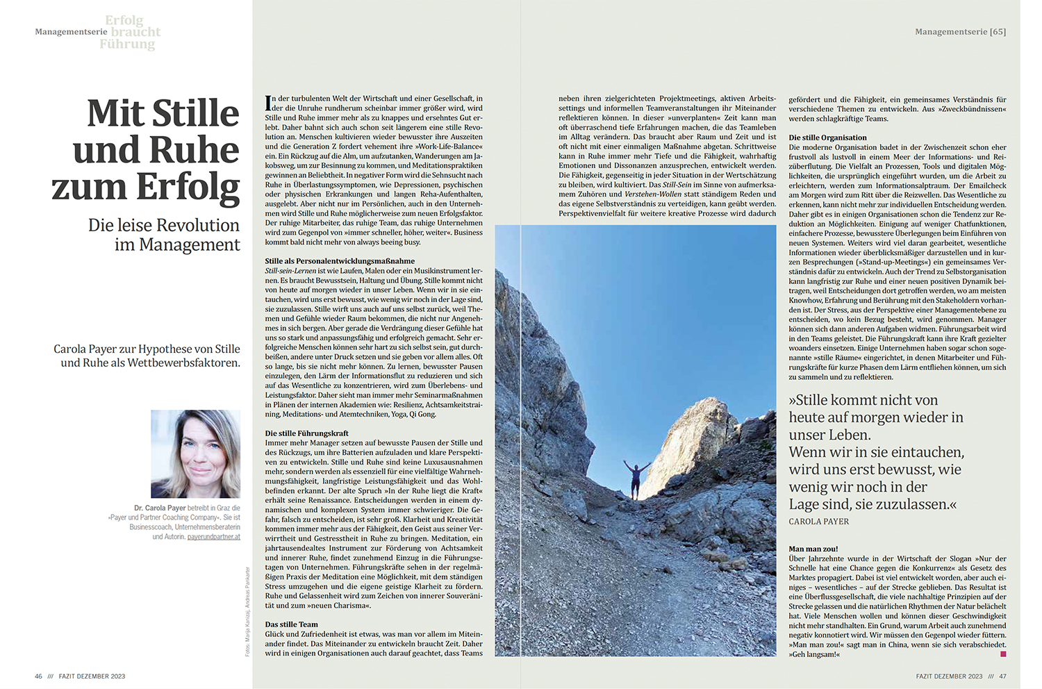 In der turbulenten Welt der Wirtschaft und einer Gesellschaft, in der die Unruhe rundherum scheinbar immer größer wird, wird Stille und Ruhe immer mehr als zu knappes und ersehntes Gut erlebt. Daher bahnt sich auch schon seit längerem eine stille Revolution an. Menschen kultivieren wieder bewusster ihre Auszeiten und die Generation Z fordert vehement ihre »Work-Life-Balance« ein. Ein Rückzug auf die Alm, um aufzutanken, Wanderungen am Jakobsweg, um zur Besinnung zu kommen, und Meditationspraktiken gewinnen an Beliebtheit. In negativer Form wird die Sehnsucht nach Ruhe in Überlastungssymptomen, wie Depressionen, psychischen oder physischen Erkrankungen und langen Reha-Aufenthalten, ausgelebt. Aber nicht nur im Persönlichen, auch in den Unternehmen wird Stille und Ruhe möglicherweise zum neuen Erfolgsfaktor. Der ruhige Mitarbeiter, das ruhige Team, das ruhige Unternehmen wird zum Gegenpol von »immer schneller, höher, weiter«. Business kommt bald nicht mehr von always beeing busy.