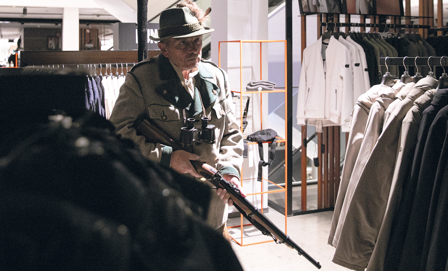 Ganz und gar nicht authentisch ist in seiner Performance jedenfalls die Natur. Die Bäume sind künstlich, das Vogelgezwitscher wohl aus Graz, aber eingespielt, dem Kaufhaus fehlt es zwar nicht an Waren, doch weder Rolltreppen noch Kassen sind aktiviert. »Bitte zusammenbleiben, es kann schnell gefährlich werden in der Natur«, ist von der Führerin und ihrem Kollegen mehrdeutigst zu hören. Oder: »Wir sind hier nur Gäste, bitte nichts hinterlassen«. Im Tiefgeschoß wird nebst der Holzdeko nahezu naturgemäß Brenngut geschlagen. Das nackte Liebespaar liegt hier auch richtig – den auch auf einer fiktiven Alm »gibt’s ka Sünd«. Dass die beiden sich in der Dirndl- und Lederhosenabteilung vergnügen, ist zusätzlich praktisch, hängt doch nur hier die veranstaltungsgerechte Kleidung danach. Apropos. Die Mode der jagenden oder musizierenden Darsteller weckt wahrlich nostalgische Gefühle. Sie bildet einen starken Kontrast zu den modernen Kollektionen, die hier feilgeboten werden. Letztlich betonen all die gezeigten steirischen Traditionen der Marke »Erlebnistag im Freilichtmuseum Stübing« eine weitere zentrale Frage: Ist ein Innenstadtkaufhaus wie »der Kastner« ein Relikt alter Tage? Als der Lift, pardon »die Gondel«, nach unten fährt, und wir wieder im Erdgeschoß ankommen, ist es schließlich Zeit für den obligatorischen Kulturabendabschluss. Richtig, es geht ums »Noch-Was-trinken-gehen«. Es war erst Mitte Oktober. Glühweinstand wurde es folglich keiner. Glücklicherweise, wie ich festhalten möchte. Immerhin gilt für die Freizeitgestaltung auch noch um Freitag ab »neine«: jedem das Seine. n