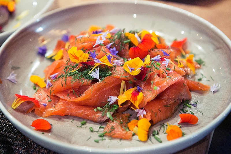 Abends trifft man sich in einer kleinen Hütte etwas flussaufwärts, wo das Wasser ruhiger ist. Im Siikakartano-Haus werden die fangfrischen Renken direkt am offenen Feuer nach traditioneller Methode zubereitet, dazu wird Sekt serviert, und während draußen das Grau des Tages in ein charmantes Abendblau übergeht, wird einem im Herzen warm. Der Fisch wird auf einem schlichten Holzbrett serviert und ebenso einfach mit den Händen gegessen. Beilage gibt es dazu keine, nur eine Vorspeise in Form eines kleinen Aals, dessen Kopf man vor dem Verzehr kurzerhand abreißt. Die Renke erinnert mehr an ein gutes steirisches Backhendl als an einen gerade am Feuer zubereiteten Fisch und zergeht auf der Zunge. Nur mit etwas Salz und dem Rauch des Feuers gewürzt, ist dies eine Art der Zubereitung, die gleichsam pur und fantastisch ist.