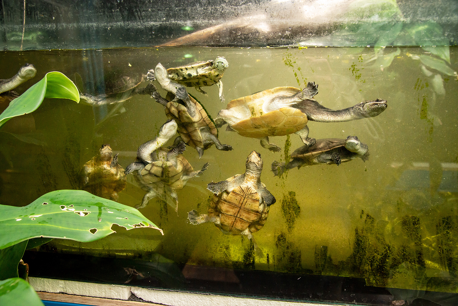 Schildkröten sind überaus faszinierende Tiere, deren archaische Schönheit sich in den Aquarien dem Betrachter besonders gut erschließt. Ihr Panzer ist ein evolutionäres Meisterwerk, das seit 220 Millionen Jahren gleichgeblieben ist. Er besteht aus zusammengewachsenen Rippen und Hautderivaten, und es ist einzigartig in der Evolution, dass Schultergürtel und Beckengürtel inklusiver aller Organe in den Rippenkorb hineinverlagert sind. Man unterscheidet insgesamt 14 Schildkrötenfamilien, 13 davon leben im Wasser. Es gibt also wesentlich mehr Wasserschildkröten als Landschildkröten, wobei vegetarische Wasserschildkröten übrigens die Ausnahme sind. Von den 360 Arten sind nur acht Meeresschildkröten, alle anderen leben im Süßwasser und an Land. Schildkröten sind eine »hochkonservative Lebensform«. Das heißt, dass sie gegenüber Veränderungen nur geringfügig anpassungsfähig sind. Peter Praschag: »Der Mensch verändert die Lebensräume ja in rasender Geschwindigkeit, da haben Schildkröten Probleme sich anzupassen. Deswegen sind rund 60 Prozent aller Arten vom Aussterben bedroht. Schildkröten und Menschenaffen sind die am stärksten bedrohten Wirbeltiergruppen, die wir kennen.« Die meisten Arten der Schildkröten sind – etwa im Gegensatz zu den Krokodilen – nicht kreuzbar, zumindest sind dann die Kreuzungen unfruchtbar. Denn Schildkröten haben sich schon sehr früh genetisch voneinander entfernt. Schildkröten werden in Halsberger – diese ziehen den Kopf teleskopartig ein – und Halswender eingeteilt. Letztere haben einen langen Hals, der seitlich eingewendet wird, wie zum Beispiel bei der Schlangenhalsschildkröte.