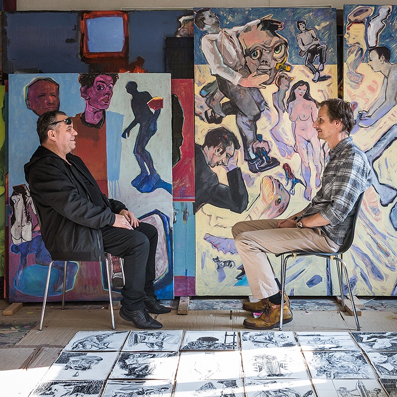 Soltys spricht gern über seine Arbeit und die Rahmenbedingungen. Offen, direkt und markant. »Der Kunstmarkt muss sich beleben«, kommentiert er die offensichtlich konzertierte Vernichtung eines Werks des britischen Künstlers Banksy Anfang Oktober bei einer Sothebys-Auktion. Er nimmt sich kein Blatt vor den Mund: »Es geht um Geld. Öffentlichkeitsarbeit ist wichtiger geworden als das Werk«. Dabei sieht er als kritischer, aber immer positiver Geist die Entwicklung gar nicht negativ: »Die Künstler werden mehr gefordert und es wird nicht alles Institutionen wie Galerien überlassen.« Der legendäre Werbefachmann und Kunsthändler Charles Saatchi habe gemeint, man muss etwas tun, damit die Kunst mehr wert wird. Wenn Kunst beispielsweise ins Museum kommt, steigt ihre Wertigkeit. Soltys: »Damit werden Erkennungsfaktor und Qualität erhöht. Und folgt noch eine Auktion, steigt der Wert noch mehr.« Aber kann das Aufgabe des Künstlers sein, wäre das nicht wie ein zweiter Job? Saatchi hat letztlich die Galerien ausgegrenzt und der Künstler Damien Hirst seine Auktion schließlich sogar privatisiert. Soltys: »Und er hat allein damit über 420 Millionen Umsatz gemacht!« Über Kunst, genauer den Kunstmarkt lässt es sich so trefflich wie unendlich diskutieren. Herbert Soltys, der sein Atelier schon seit mehr als 30 Jahren betreibt, hat an der Grazer Kunstgewerbeschule bei Otto Brunner gelernt, hatte einen Lehrauftrag an der heutigen Kunstuni, war Leiter für Bühnenbild der Werkstätten der Vereinigten Bühnen Graz und ist seit 2007 freischaffend tätig. Sein Werk umfasst geschätzte 3000 Bilder und besitzt bei aller Vielfalt hohen Wiedererkennungswert. Eindeutig steht der menschliche Körper im Mittelpunkt des Soltys-Universums. Wenn die Tore des Ateliers größer wären, würde er wahrscheinlich noch größere Bilder malen, so beschränkt sich das Maß auf 240 mal 200 Zentimeter. Konkrete bis abstrakte Körper bevölkern seine Leinwände und geben Rätsel und Interpretationsmöglichkeiten auf, perspektivische Verkürzungen und extreme Winkelansichten zeugen von handwerklicher Perfektion. Der körperliche Einsatz des Malers ist förmlich spürbar, so sagt er über seine Malweise auch: »Mit Herz, Hirn und Faust.«