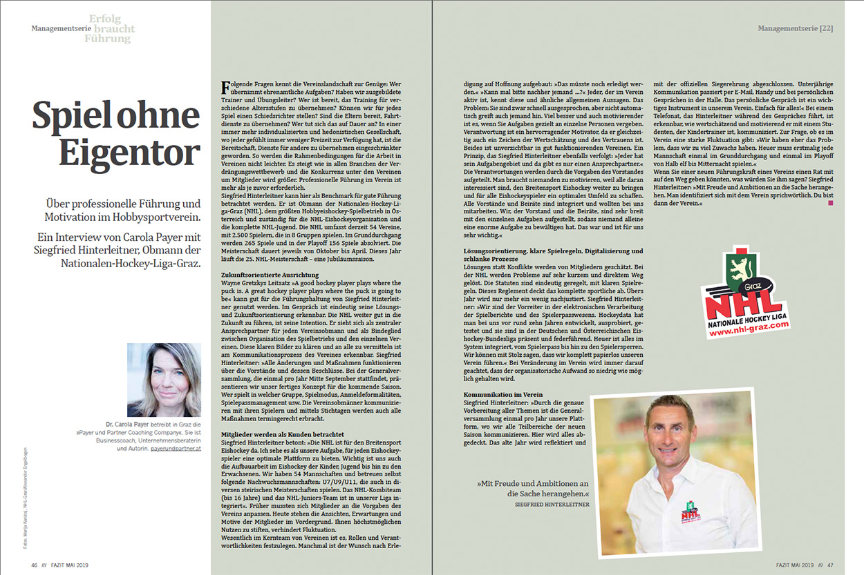 Siegfried Hinterleitner kann hier als Benchmark für gute Führung betrachtet werden. Er ist Obmann der Nationalen-Hockey-Liga-Graz (NHL), dem größten Hobbyeishockey-Spielbetrieb in Österreich und zuständig für die NHL-Eishockeyorganisation und die komplette NHL-Jugend. Die NHL umfasst derzeit 54 Vereine, mit 2.500 Spielern, die in 8 Gruppen spielen. Im Grunddurchgang werden 265 Spiele und in der Playoff 156 Spiele absolviert. Die Meisterschaft dauert jeweils von Oktober bis April. Dieses Jahr läuft die 25. NHL-Meisterschaft – eine Jubiläumssaison.