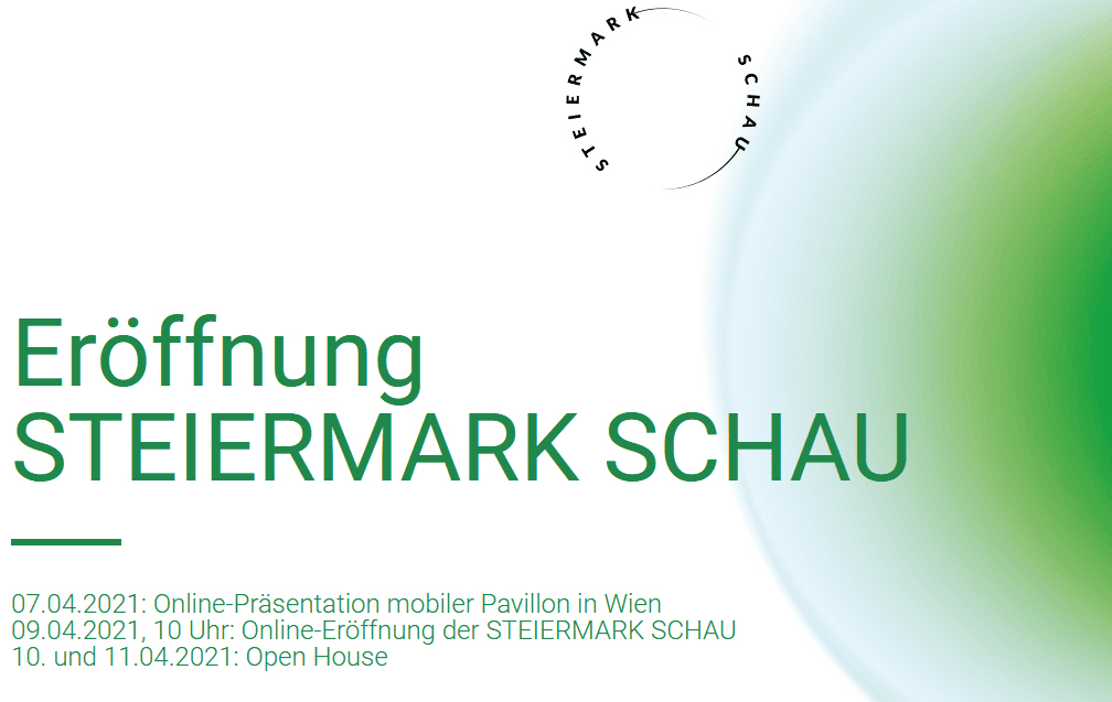 Die erste »Steiermark Schau« vom 10. April bis 31. Oktober 2021 wird am 9. 4. ab 10.00 Uhr eröffnet. Schon heute wird um 18.00 Uhr der mobile Pavillon in Wien präsentiert. Beides gibt es als Livestream im Netz.