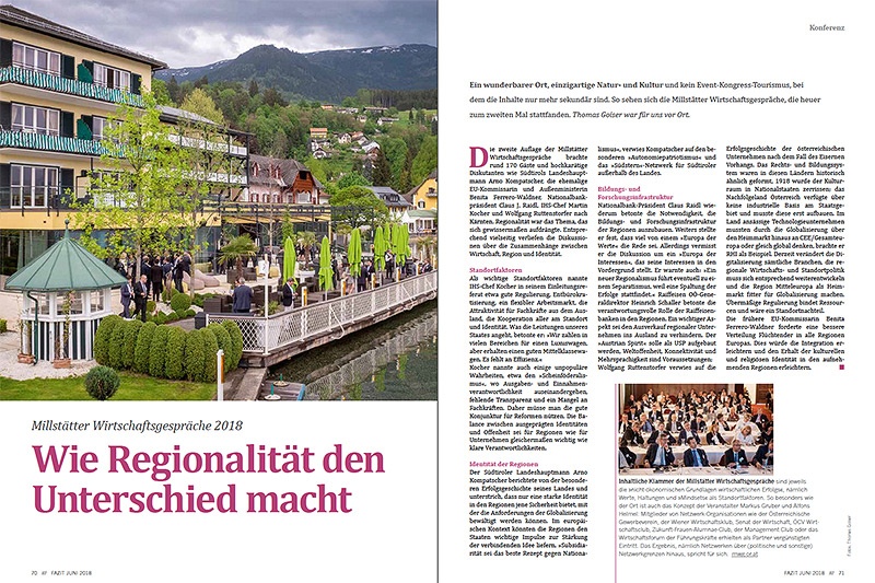 Die zweite Auflage der Millstätter Wirtschaftsgespräche brachte rund 170 Gäste und hochkarätige Diskutanten wie Südtirols Landeshauptmann Arno Kompatscher, die ehemalige EU-Kommissarin und Außenministerin Benita Ferrero-Waldner, Nationalbankpräsident Claus J. Raidl, IHS-Chef Martin Kocher und Wolfgang Ruttenstorfer nach Kärnten. Regionalität war das Thema, das sich gewissermaßen aufdrängte. Entsprechend vielseitig verliefen die Diskussionen über die Zusammenhänge zwischen Wirtschaft, Region und Identität.