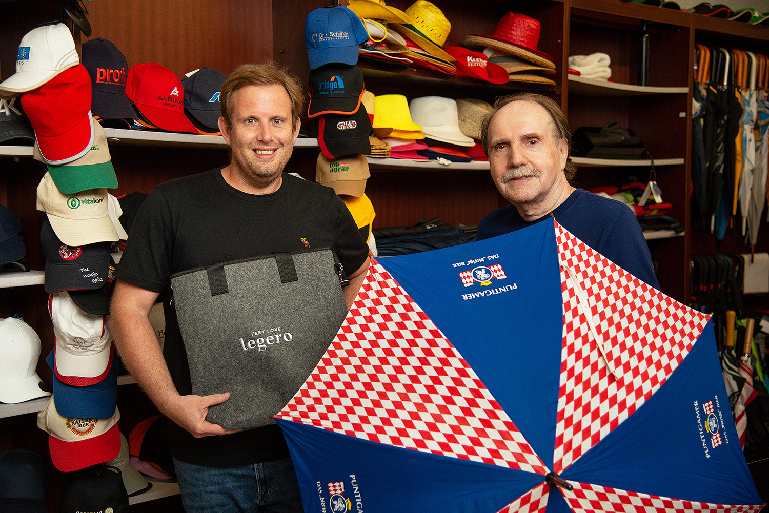 »Beim Katholikentag Anfang der Achtziger hatten wir das Glück, dass es geregnet hat. Wir konnten innerhalb von wenigen Tagen 200 Regenschirme liefern. Auch der Papst hatte einen von uns«, freut sich Radlgruber senior noch heute. Das beliebte Werbegeschenk Regenschirm war seit jeher ein spannendes Thema: Um auch den damals schon letzten Hersteller von Regenschirmen in Österreich – die Firma Interschirm im burgenländischen Breitenbrunn – zu schützen, wurde früher auf Importware ein Schutzzoll von bis zu 70 Schilling eingehoben, so dass ein Regenschirm mehr 100 Schilling gekostet hätte. Radlgruber: »Unser Trick war, die Regenschirme in Teilen zu importieren: das Gestell und die Bespannung extra. Dann war nur ein niedrigerer Zoll drauf. Bei einem Auftrag von Raiffeisen über 500 Regenschirme habe ich alle selbst genäht und an den Speichen befestigt – das war der Pioniergeist. Heute sind wir einer der wenigen Betriebe, die Regenschirme mit Namen unter einer Schicht Epoxyharz bedrucken können – ein sehr persönliches Geschenk.«