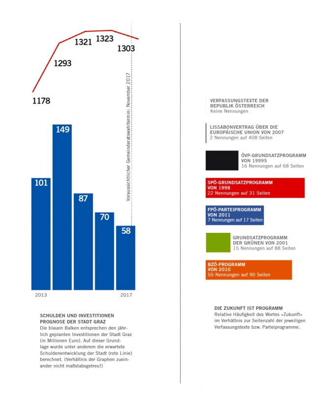 In den Verfassungstexten der Republik Österreich kommt das Wort Zukunft allerdings kein einziges Mal vor. Das liegt zum einen daran, dass es sich vor allem um ein Regelwerk für die politischen Institutionen handelt, zum anderen aber wohl auch daran, dass noch keine PR-Strategen und Werbe-Gurus daran herumschreiben durften. Im Vertrag von Lissabon, dem aktuell gültigen Regelwerk der Europäischen Union, kommt »Zukunft« immerhin zweimal auf 400 Seiten vor. In den Grundsatz- bzw. Parteiprogrammen der österreichischen Parteien sieht es schon anders aus. Alle nehmen sich etwas vor für die Zukunft. Und natürlich nur das Beste. Dass sich von der Häufigkeit der Nennung auf die politische Qualität schließen ließe, ist natürlich Unsinn. Aber die Grafik (Seite 11)